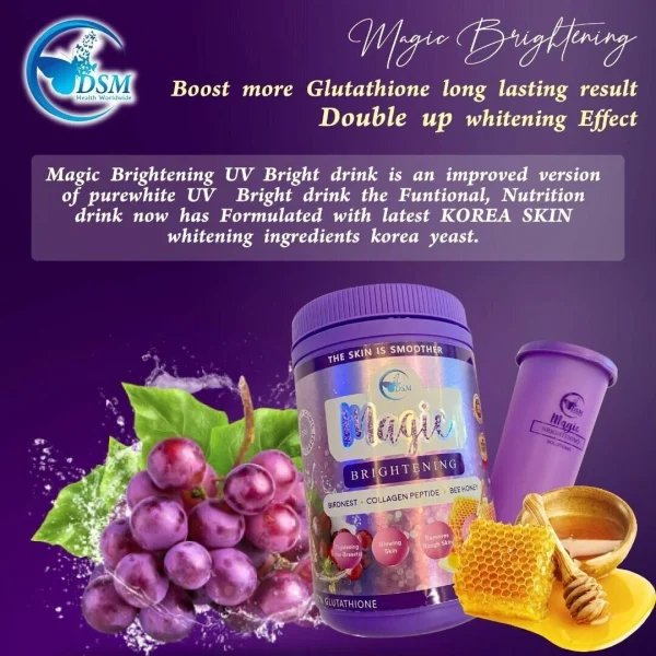 ? Magic Brightening UV Bright drink is an improved version of purewhite UV  Bright drink the Funtional, Nutrition drink now has Formulated with latest *KOREA SKIN*  brightening  ingredients korea yeast.